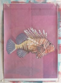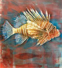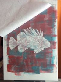 После высыхания краски бумагу срезали с планшета и пропустили через струйный принтер. Размер срезанного листа с рисунком должен точно соответствовать размеру эскизного отпечатка, иначе не добиться совмещения печатной графики и нарисованных деталей фона. Для этого при переводе изображения мы отметили контуры эскизного принтерного отпечатка. Затем по этим меткам обрезали ватманский лист, предназначенный для печати. Послепечатная обработка: несколькими движениями широкой кисти придали динамику фону, тонким колонком дорисовали плавники. Законченный графический лист закрепили акриловым лаком