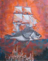 Летучий голландец. 420´600 мм. Бумага, перламутровая гуашь, печать на принтере Epson Stylus Pro 4800. В графическом редакторе подготовлен коллаж из старых гравюр. Основа — бумага, загрунтованная перламутровой гуашью. Светлые части изображения пастозно прокрыты акриловыми белилами. Послепечатная обработка — прорисовка деталей оснастки корабля и рыбы, доработка фактуры фона