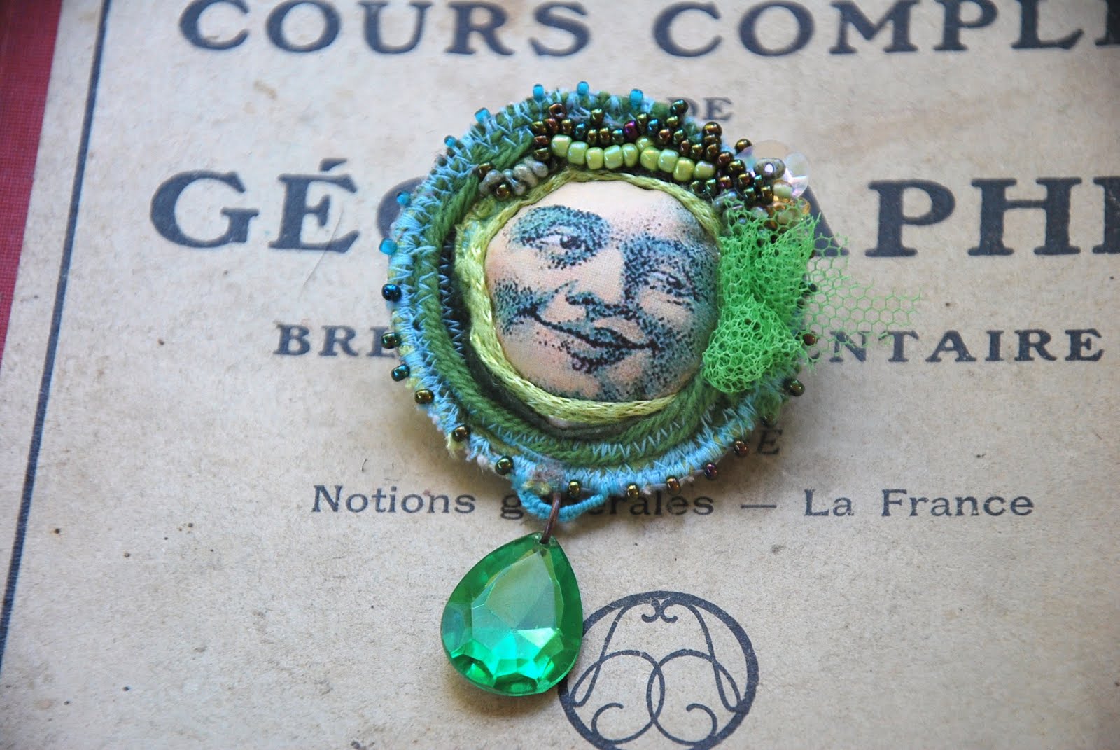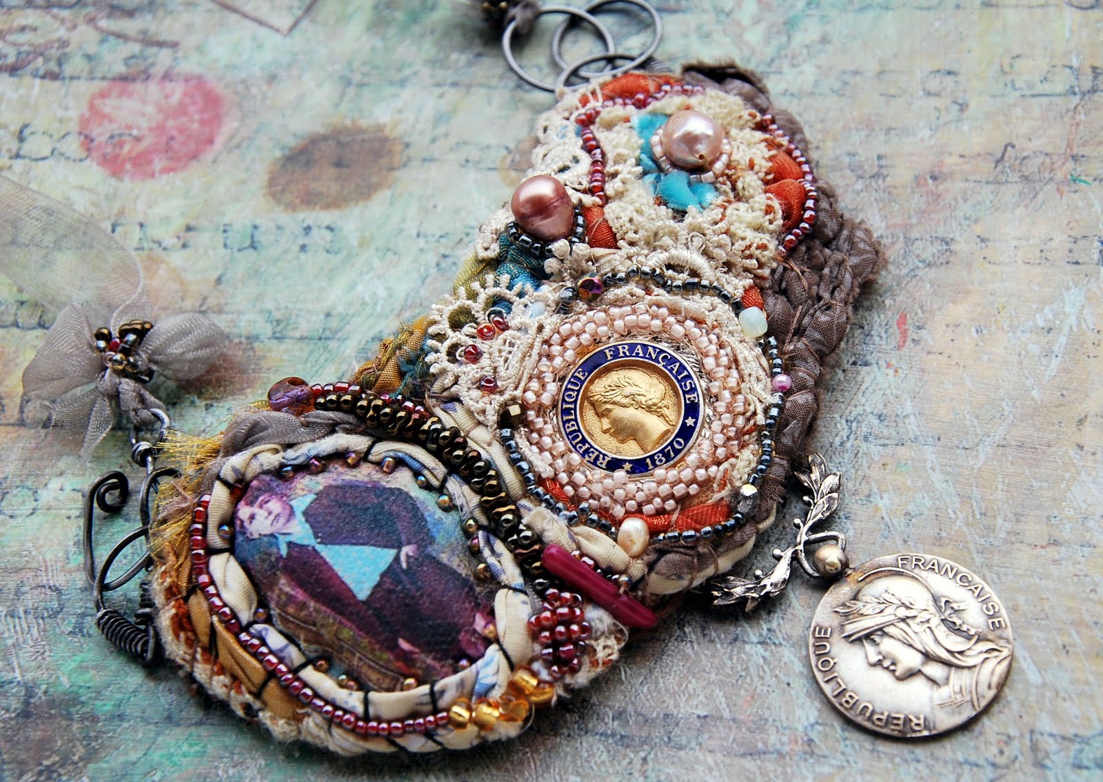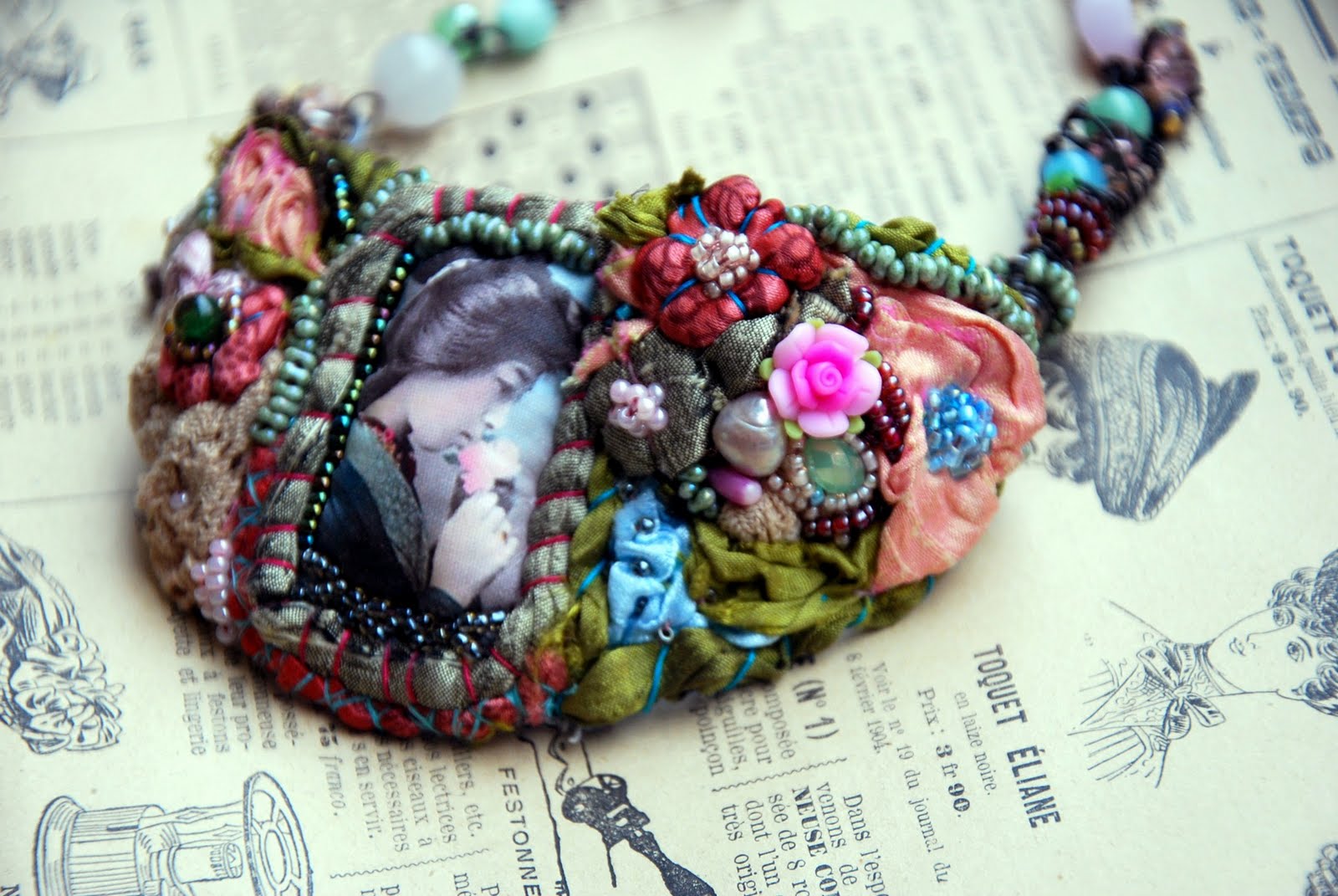 А это романтческое колье я делала перед Рождеством для моей дорогой подруге. Она захотела отдать должное своему отцу. Таким образом я перевела на ткань цифровое изображение ее отца и включила в колье военную медаль отца. Это было непросто сделать колье для женщины с мужественными элементами...