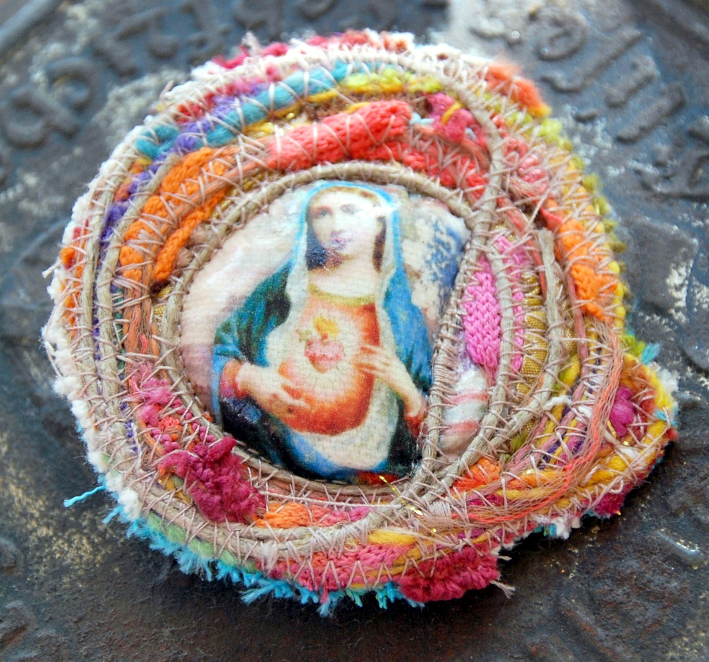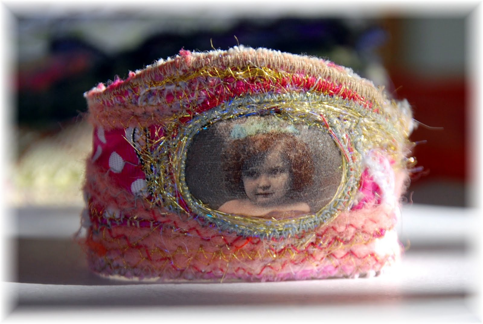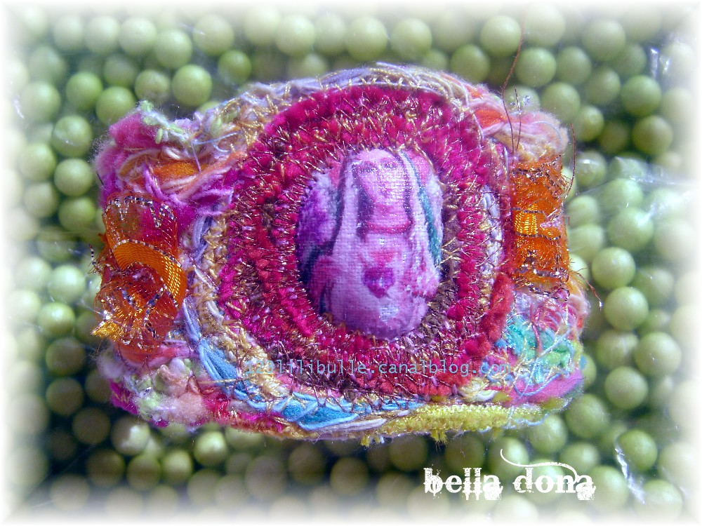 А это романтческое колье я делала перед Рождеством для моей дорогой подруге. Она захотела отдать должное своему отцу. Таким образом я перевела на ткань цифровое изображение ее отца и включила в колье военную медаль отца. Это было непросто сделать колье для женщины с мужественными элементами...