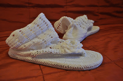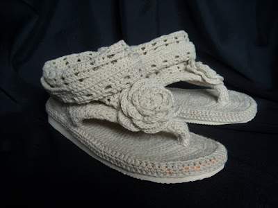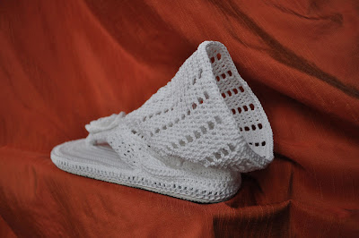 Обычные шлепки-вьетнамки, надо только чтоб полоски были тонкие, ну, или подрезать до нужной ширины (в одном варианте я так и делала) чтоб при обвязке не толсто получилось.